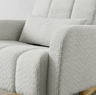 Featuring a high back, an ottoman, and an extended plush throw cushion for feeding or lumbar support, our beloved parents can indulge in sublime relaxation on this dreamy, cloud-like nursery chair, enveloped in the finest boucle fabric. Additionally, we've thoughtfully included conventional legs, allowing a seamless transformation into a standard chair when the rocking serenity concludes. Bid farewell to uncomfortable, pricey, and unflattering nursery chairs; say hello to a new era of stylish comfort!